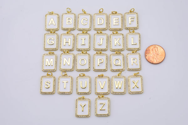 14k Gold White Enamel Initial Tag Letter Charm CZ Cubic Alphabet Letter Drop Charm Pendant Personalized Charm for Necklace Jewelry Making