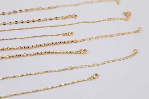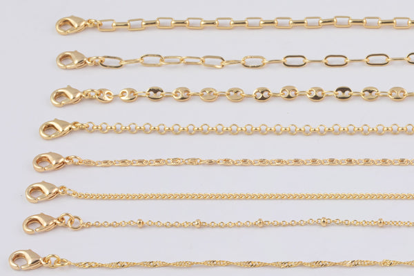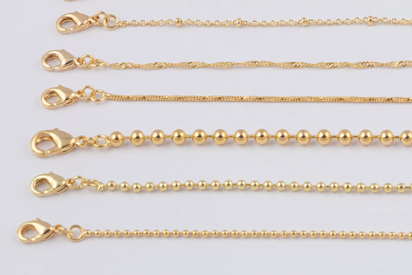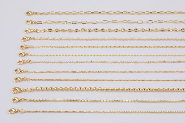 16" Gold Plated Anti-Tarnish Gold Necklace Singapore Ball Rolo Satellite Rectangle Oval Paperclip Chain with Extender Perfect for Layering