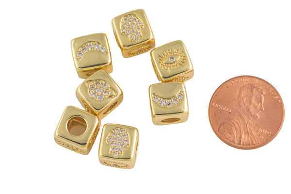 1 pc 18kt Gold - Lucky Symbol Cube Bead- Different Symbols on each side- Evil eye, Hamsa Hand, Moon, Planets- 5mm Hole- 9mm