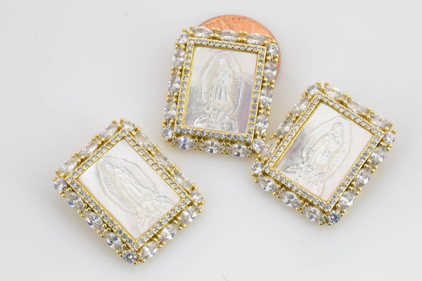 Mother of Pearl Saint Mother Mary Rectangular Pedant - Natural Mother of Pearl Bezeled with CZ Paves 1 pc 20x24mm