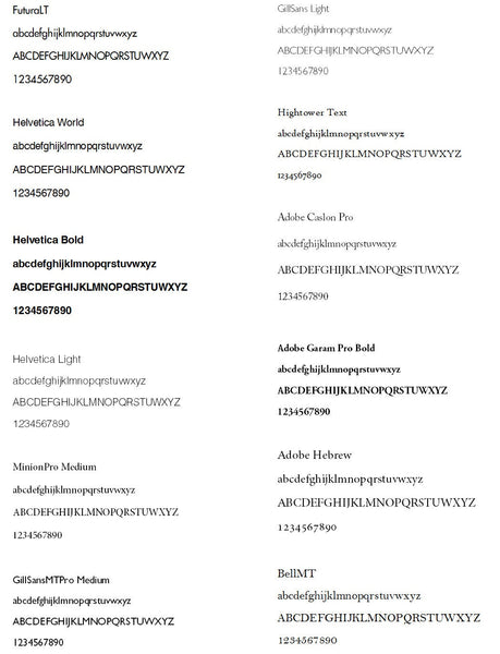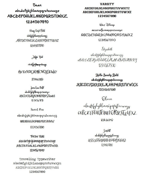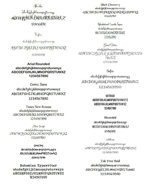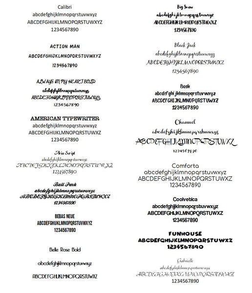 IF YOU DO NOT SEE YOUR FONT LISTED HERE YOU CAN LEAVE IT IN THE NOTES SECTION OF THE ORDER.