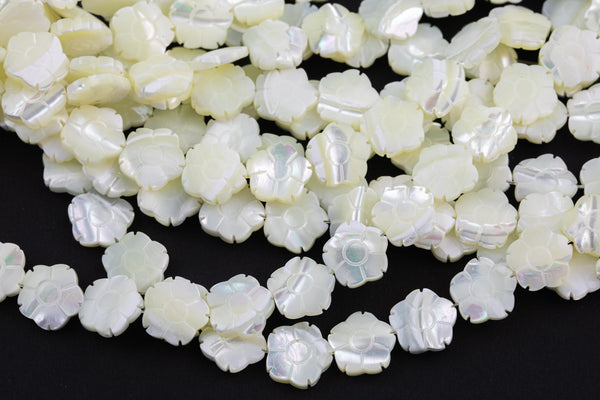 AAA Iridescent Carved Natural White Mother of Pearl Shell Carved Flower Beads 10mm and 12mm 15.5" Strand Shell Beads