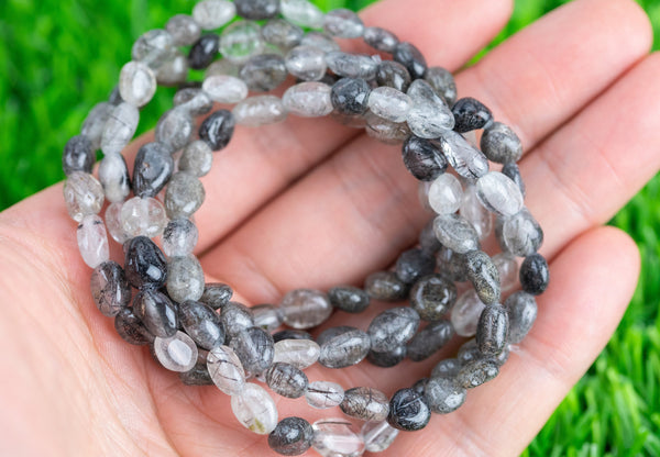 Black Tourmalinated Quartz Stretchy String Oval Bracelet Natural Crystal Gemstone Bracelets - Gemstone Nugget Bracelets Handmade Jewelry