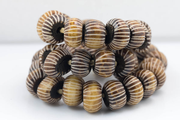 Check out these beautiful large bone batik from Africa! They are hand dyed beads from Kenya, Africa. The dying method is known as "batik", which is a wax relief process. The design on these is an unusual carved design. These beads are strung on raffia and could even be worn as is. Some strands have a more worn vintage appearance. The strand is approximately 25-26" long and each bead is about 24mm in diameter. They are perfect for any of your beading needs! Due to the handmade nature of these beads some beads may have a wood core that is more secure than others.